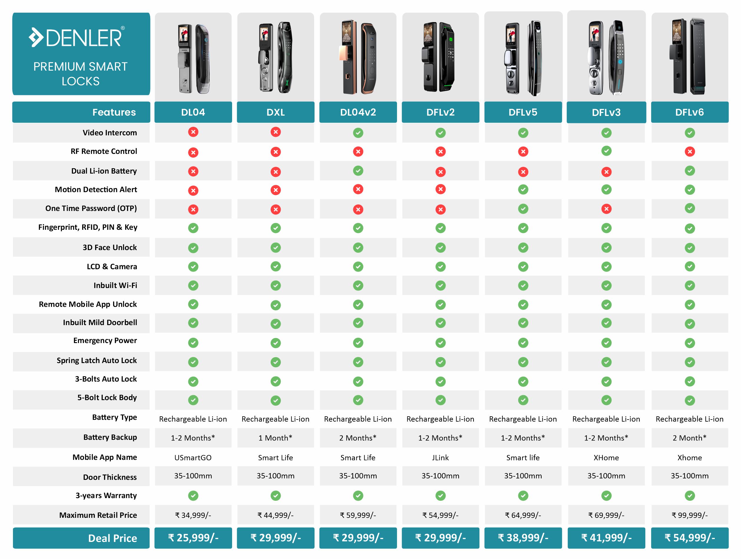 Premium segment smart locks with features like Palm Vein Sensor, 3D Face Recognition, Audio-Video Intercom, Anytime Remote Unlocking with Mobile App, Dual Battery, Electronic Mortise, Motion Sensor, Built-in Wi-Fi and lot more…